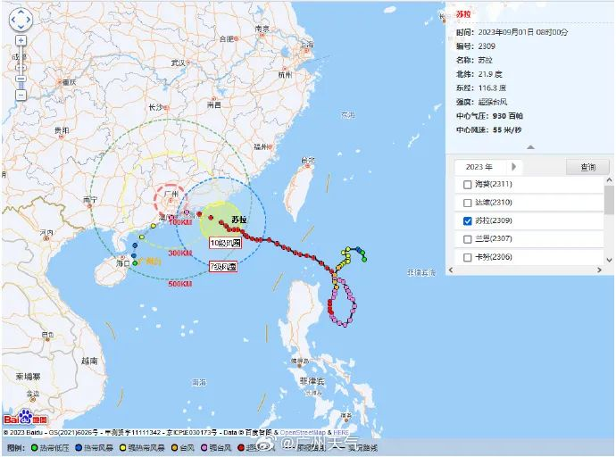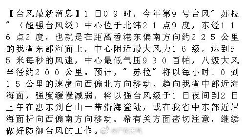 截至1日09時,“蘇拉”(超強台風級)中心位於距離廣州市東南方向約315公裏的南海東北部海麵上,也就是北緯21.9度、東經116.2度,中心附近最大風力16級(55米/秒),中心最低氣壓930百帕。