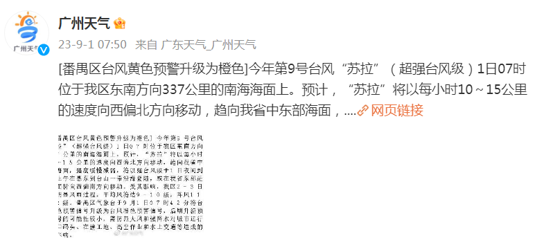 另外據市氣象台監測,廣州市達到啟動氣象災害(台風)Ⅲ級應急響應標準。市氣象災害應急指揮部決定從9月1日2時56分起將廣州市氣象災害(台風)Ⅳ級應急響應升級為Ⅲ級應急響應。請按照預案規定做好防禦工作。