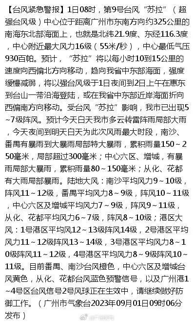 目前番禺、南沙台風橙色,中心六區及增城台風黃色,從化、花都台風藍色預警信號,以及廣州港1~4號區台風信號2號風球正在生效中,請繼續做好防禦工作。